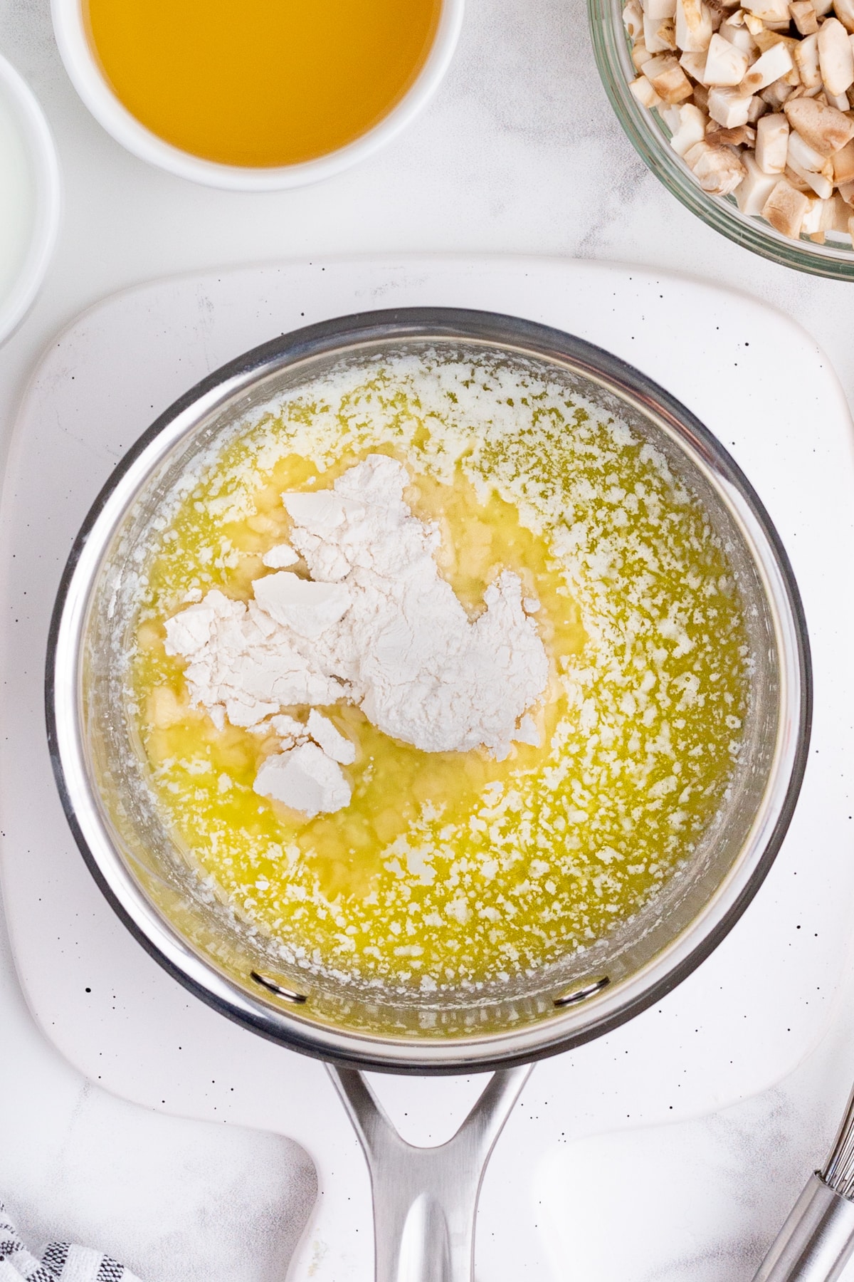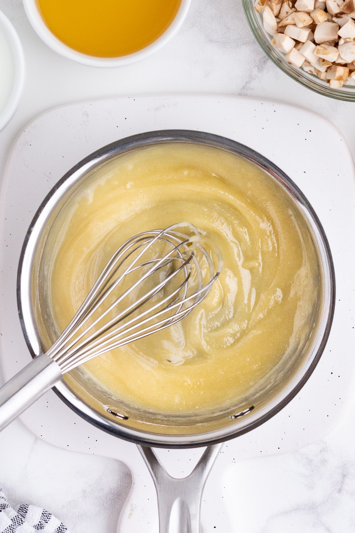 Melt butter in a saucepan over medium-low heat. Whisk in flour. Continue whisking until the mixture is smooth and bubbly, making a roux.