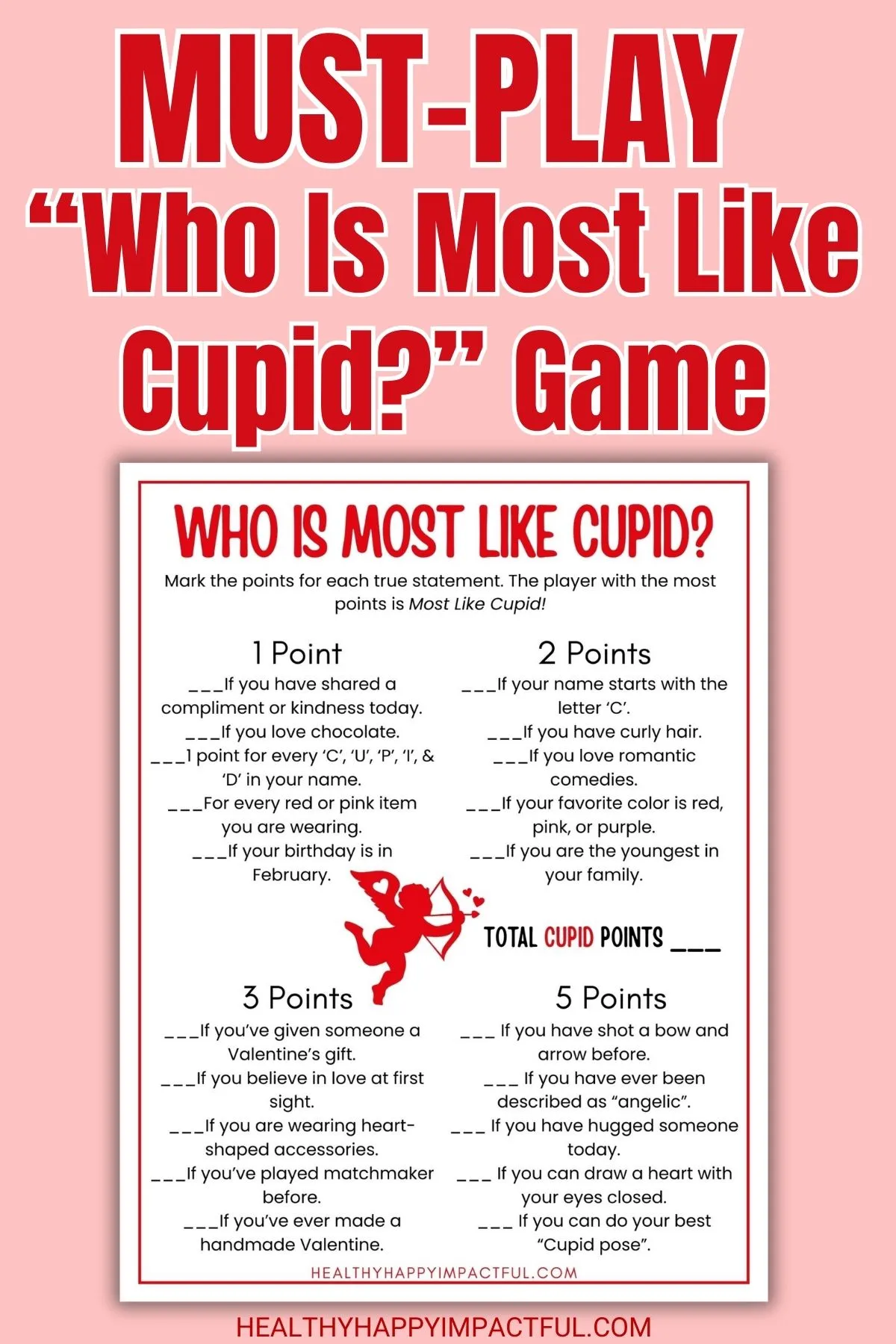 Players read through a list of cute, quirky statements, mark off the ones that are true, and add up their points. Then they see who earns the ultimate title of… MOST LIKE CUPID!